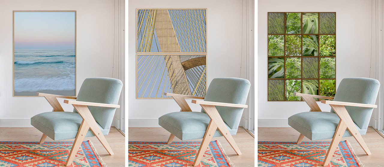 Acreditamos que o uso de quadros se consolidou em função da grande versatilidade que a fotografia propõe. A possibilidade de criar diferentes composições ou quadros únicos, produzir em grandes ou pequenos formatos, diferentes cores e texturas, variados estilos como abstrato ou paisagem mudam completamente o impacto visual da obra.